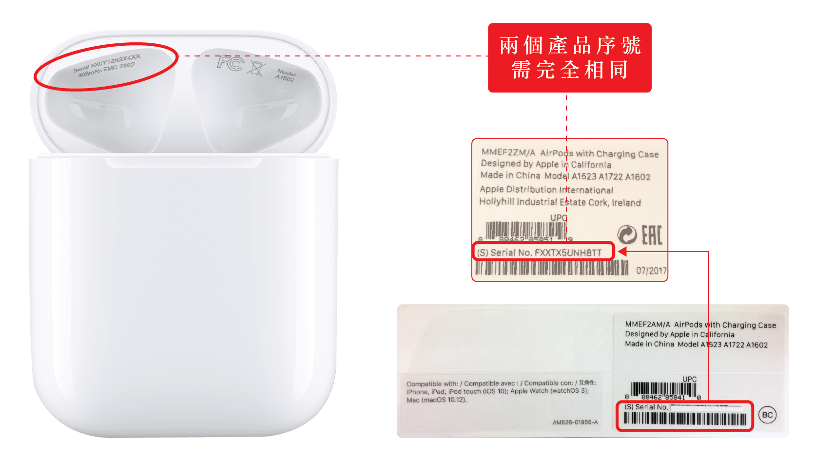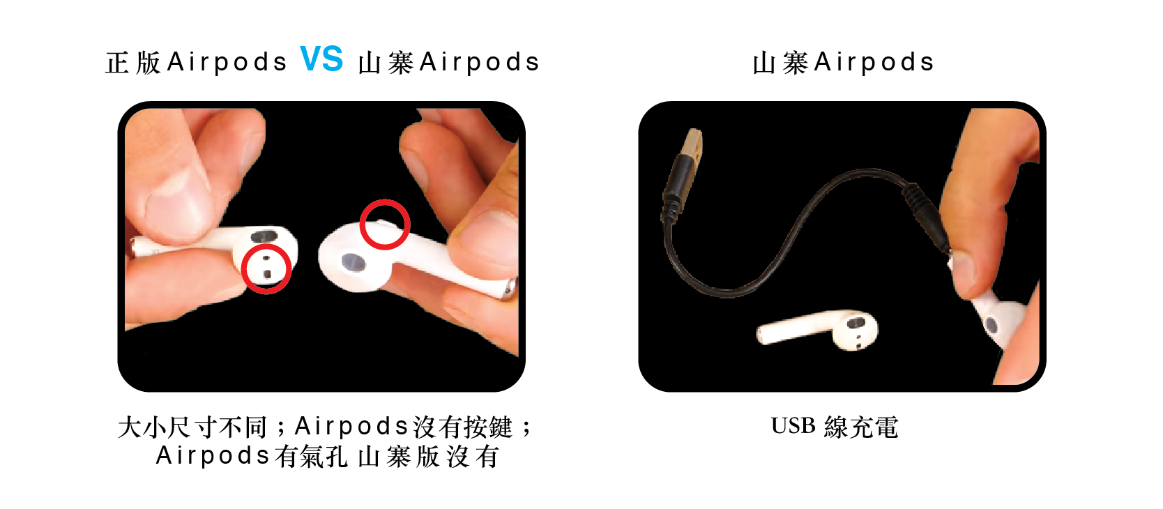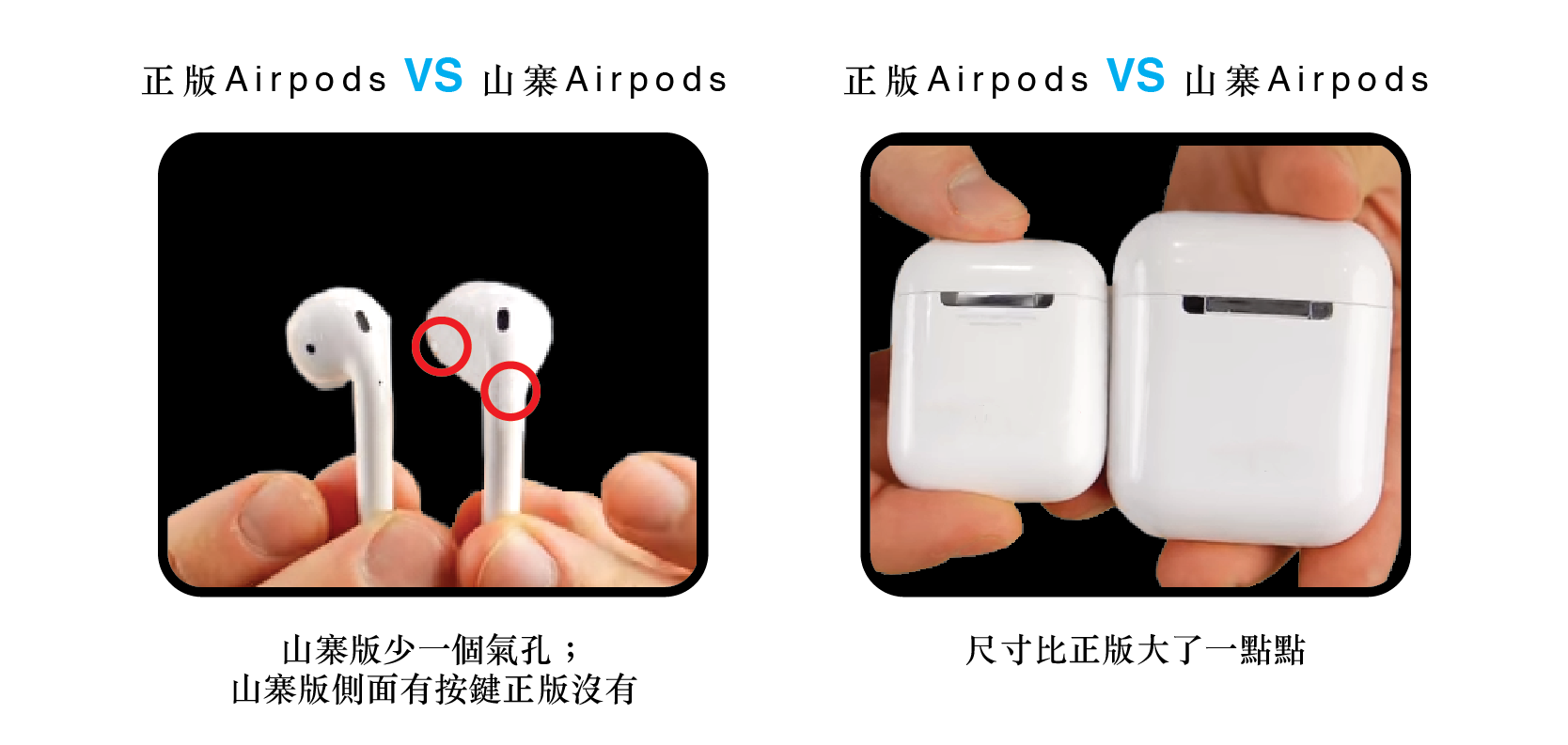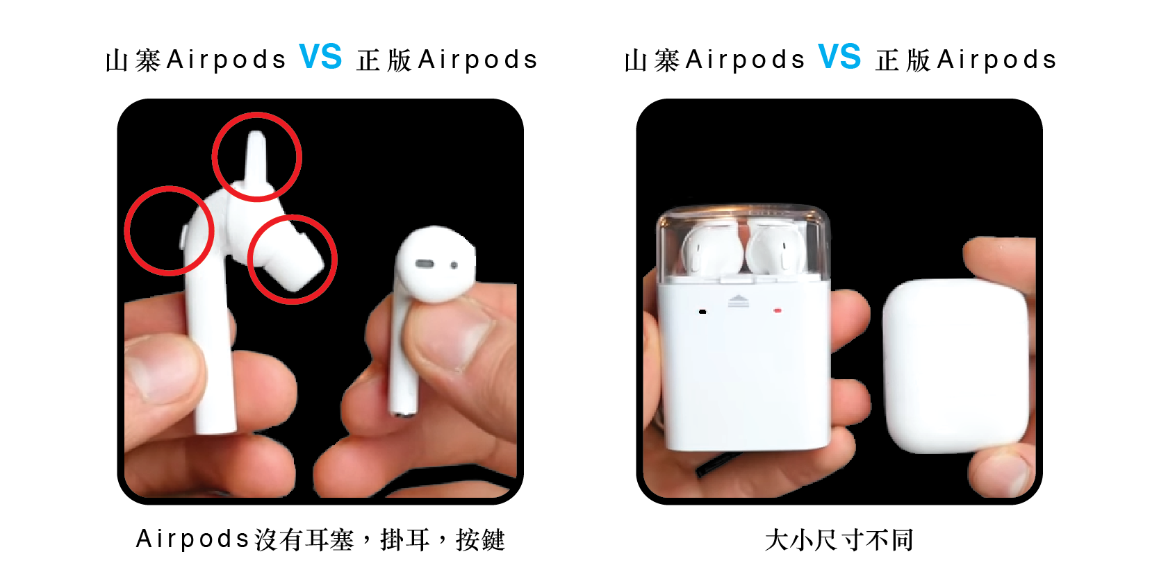 正版 Airpods 的包裝盒跟充電盒上都應該要有產品序號, 且兩個序號需完全相同,如果兩個或有一個沒有序號或不相同則為山寨版 Airpods。在Apple 官網輸入序號可以看保固狀態和確認是否為正版。