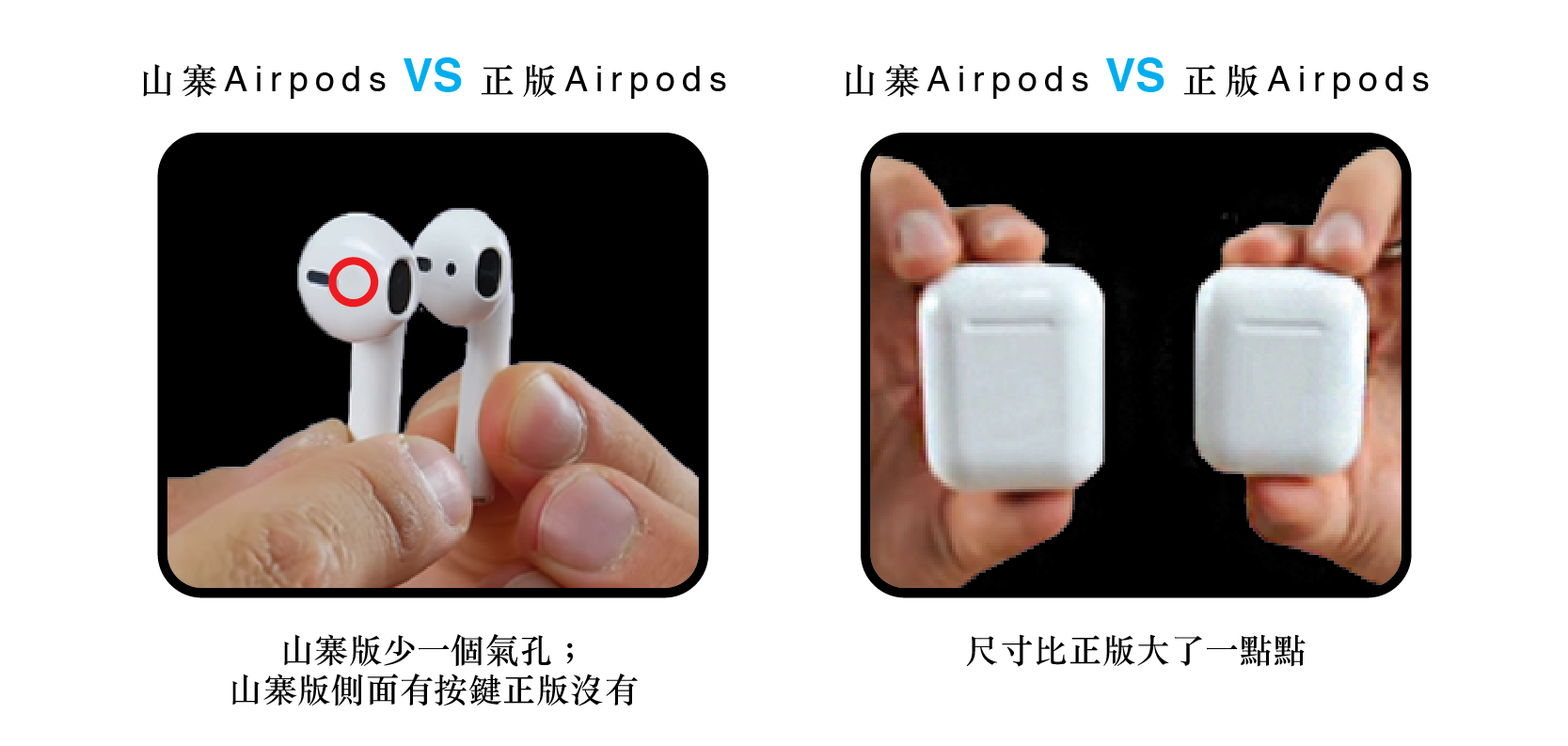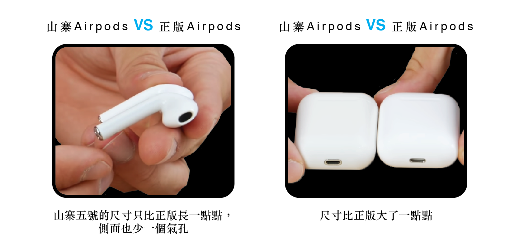 比較市面上目前有看到的三款山寨版 Airpods,下面這些設計都是山寨版 Airpods 才有的。