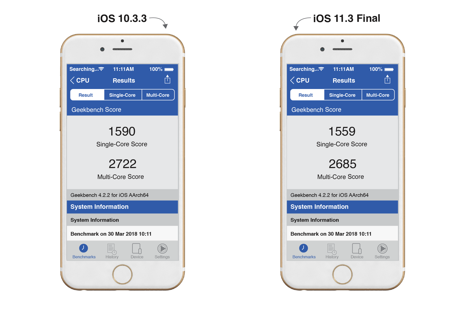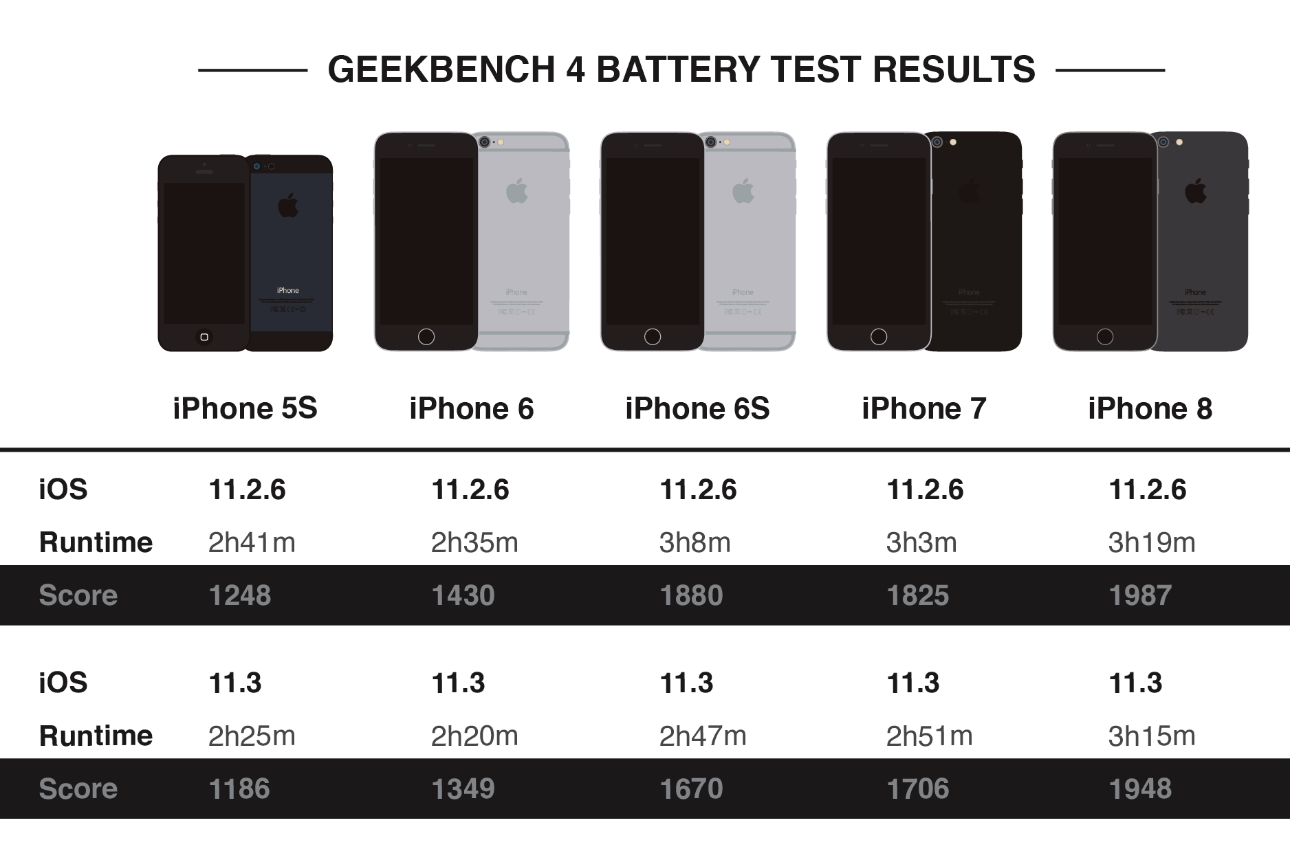 測試 App 是 Geekbench 4 的電池效能測試功能,他使用同樣的手機先測試 iOS 11.2.6 然後更新到 iOS 11.3 再跑一次同樣的電池測試,使用的 iPhone 電池耗損水準都在 95% 以上,算是很能做為參考的數據 ( 測試 6s 的CPU 是台積電生產的 )。