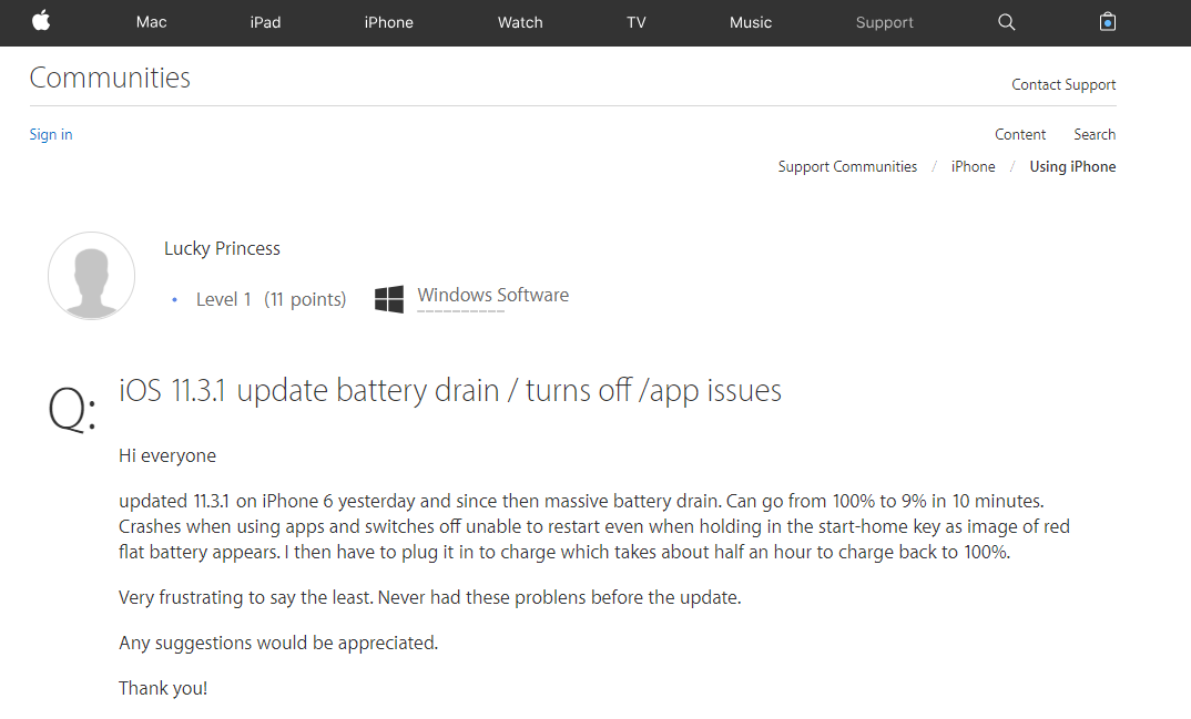 這是在 iPhone 的官方論壇,有一個 iPhone 6 的使用者在升級後發現電量在 10 分鐘內從 100% 掉到 9%,接著使用 App 時當機無法重開機 。而且這個情況在他之前更新從沒出現過這是第一次發生。Source
