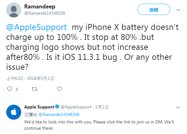 一個 iPhone X 使用者在 Twitter 上回報他的手機只能充到 80%,可能有充電的 Bug。Source